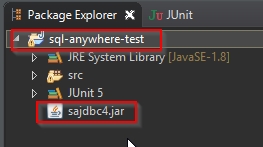 16.0 | %SQLANY16%\java\sajdbc4.jar | no longer required for JDBC 4.0 | jdbc:sqlanywhere:uid=DBA;pwd=sql;eng=demo |